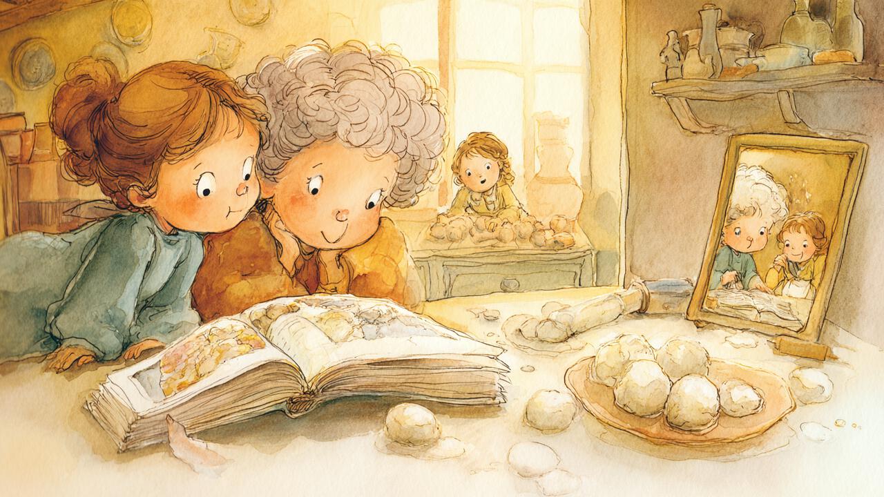 ისევ წიგნის იმ გვერდს დავხედე, რომელზეც მოხუცისა და ქადების ამბავი ამოვიკითხე, მაგრამ ჩემი ყურადღება ახლა ილუსტრაციამ მიიქცია. აქ მხატვარს უშველებელი მაგიდა დაედგა, რომელზეც ცომის გუნდები იყო გაშლილი. მაგიდასთან კი თავწაკრული ფუმფულა ბებო იდგა, რომელსაც ხელში ცომის გასაბრტყელებელი ეჭირა და უკმაყოფილო ჩანდა.