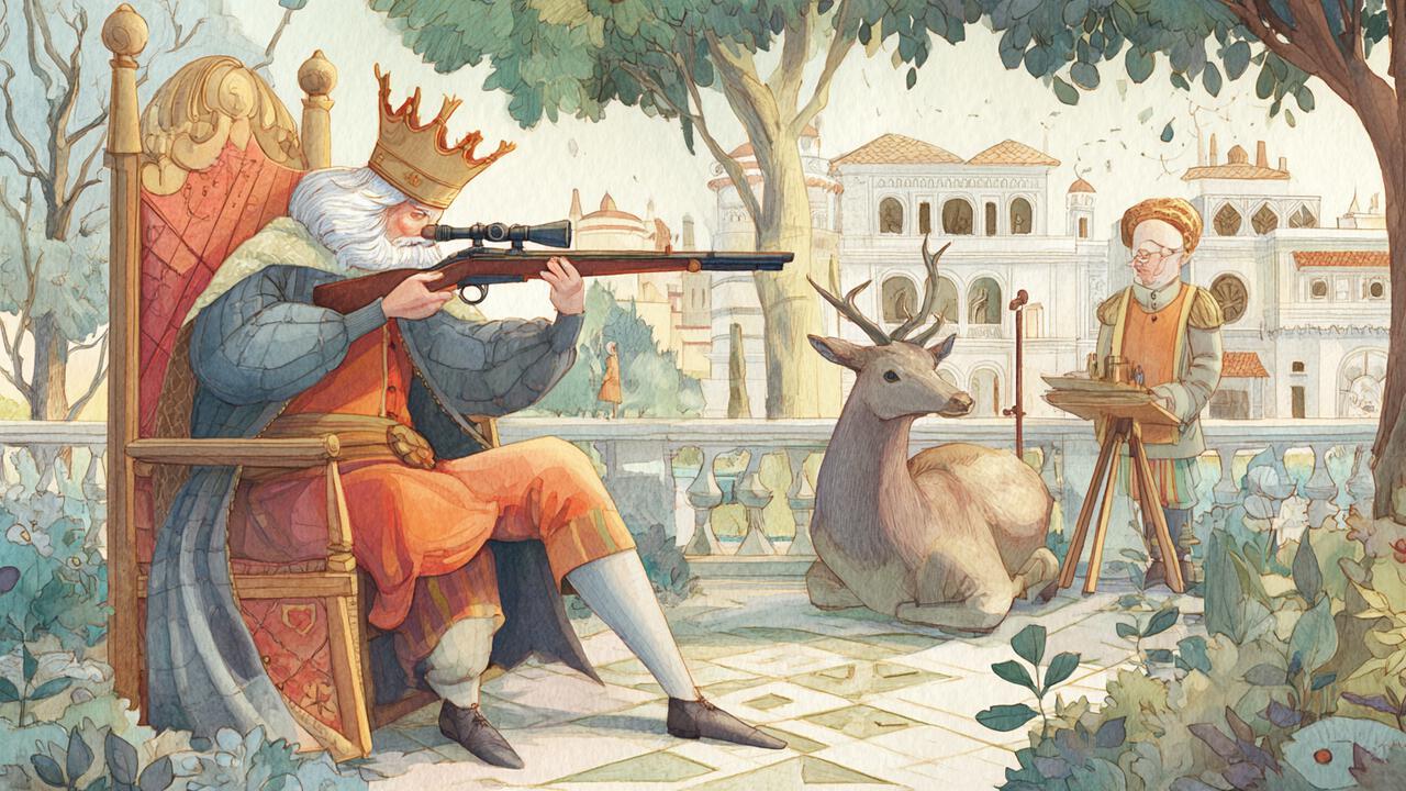 მოიპოვა ესე ღონე: დახატა ირემი და მეფესა ხელთ თოფი მისცა, ბრმა თვალი დაუხუჭა და მიართვა მეფესა. ამ საქმეს მიზეზი ვერა ჰპოვა, და მორჩა მხატვარი იგი.