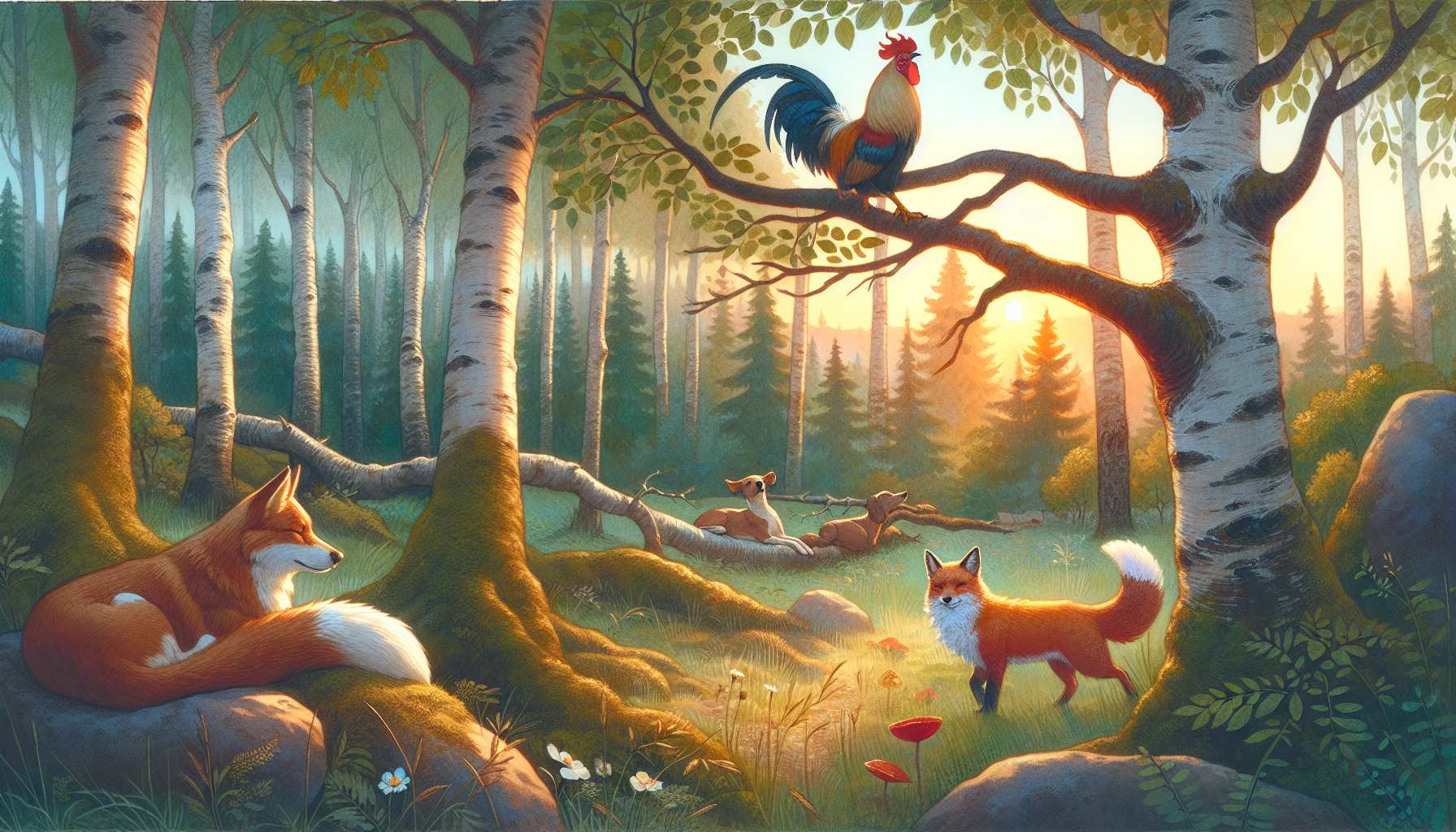 წავიდენ ტყეში. ძაღლმან ყეფა დაიწყო და დაეძინა. მამალი ხეზე შეჯდა, ყივილი დაიწყო. მელს ხმა ესმა, მოვიდა, მამალს ჰკითხა: მანდ რასა იქმო?