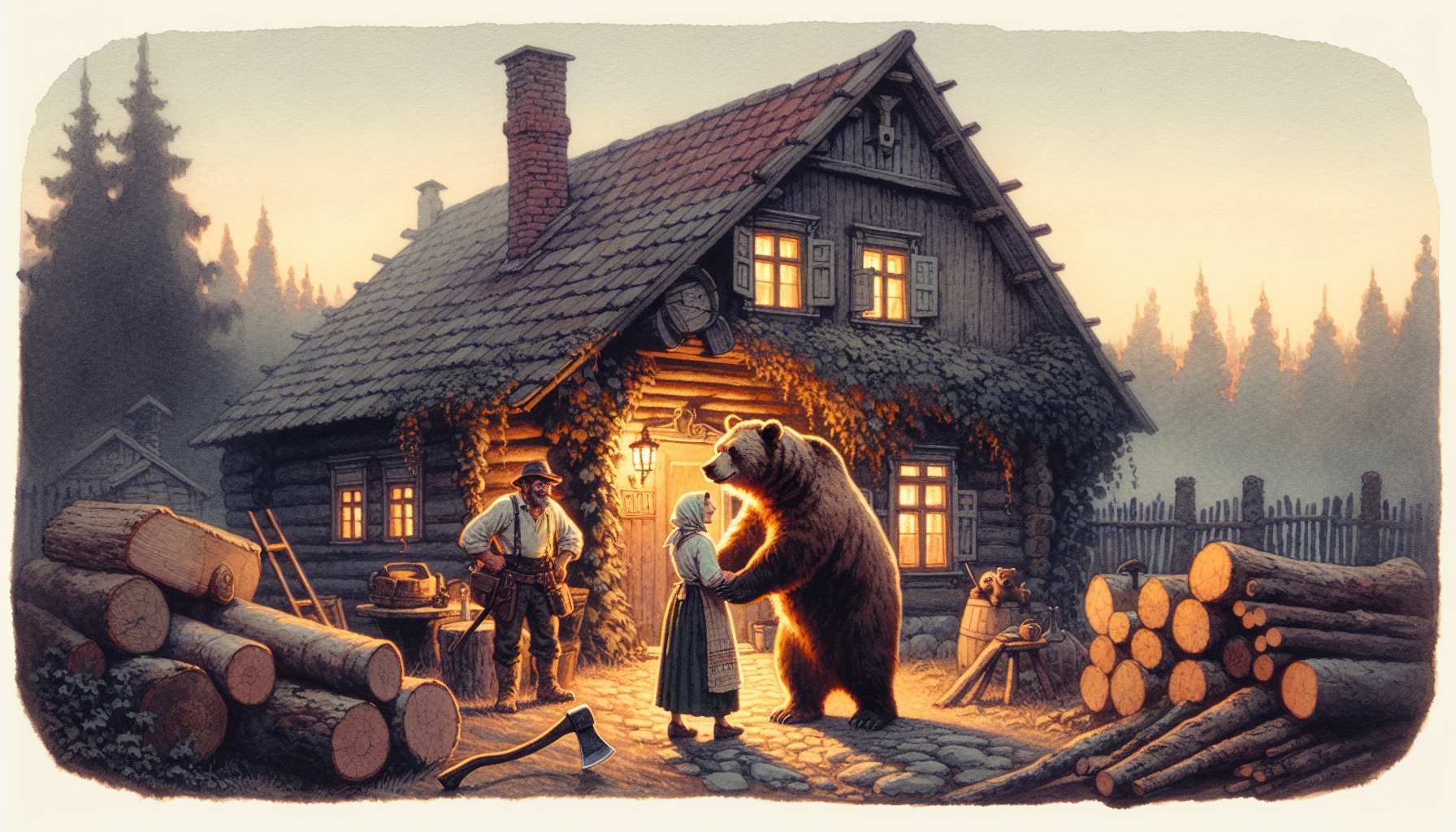 მოვიდა დათვი და, რაც მათ ეფერებოდა, იმგვარად იალერსეს. მერმე დათვმან დაუჟინა: თავზე ერთი ცული დამკარ და დამკოდეო!