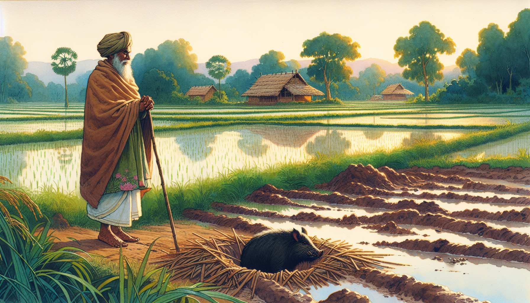 გილანს ერთი მოლა იყო. ბრინჯი დაეთესა და ველურმან ღორებმან დია წაუხდინეს. მოლამ ღორის ქაშანზე დიდი ორმო ჩათხარა და ლელი წაჰბურა და წამოვიდა.