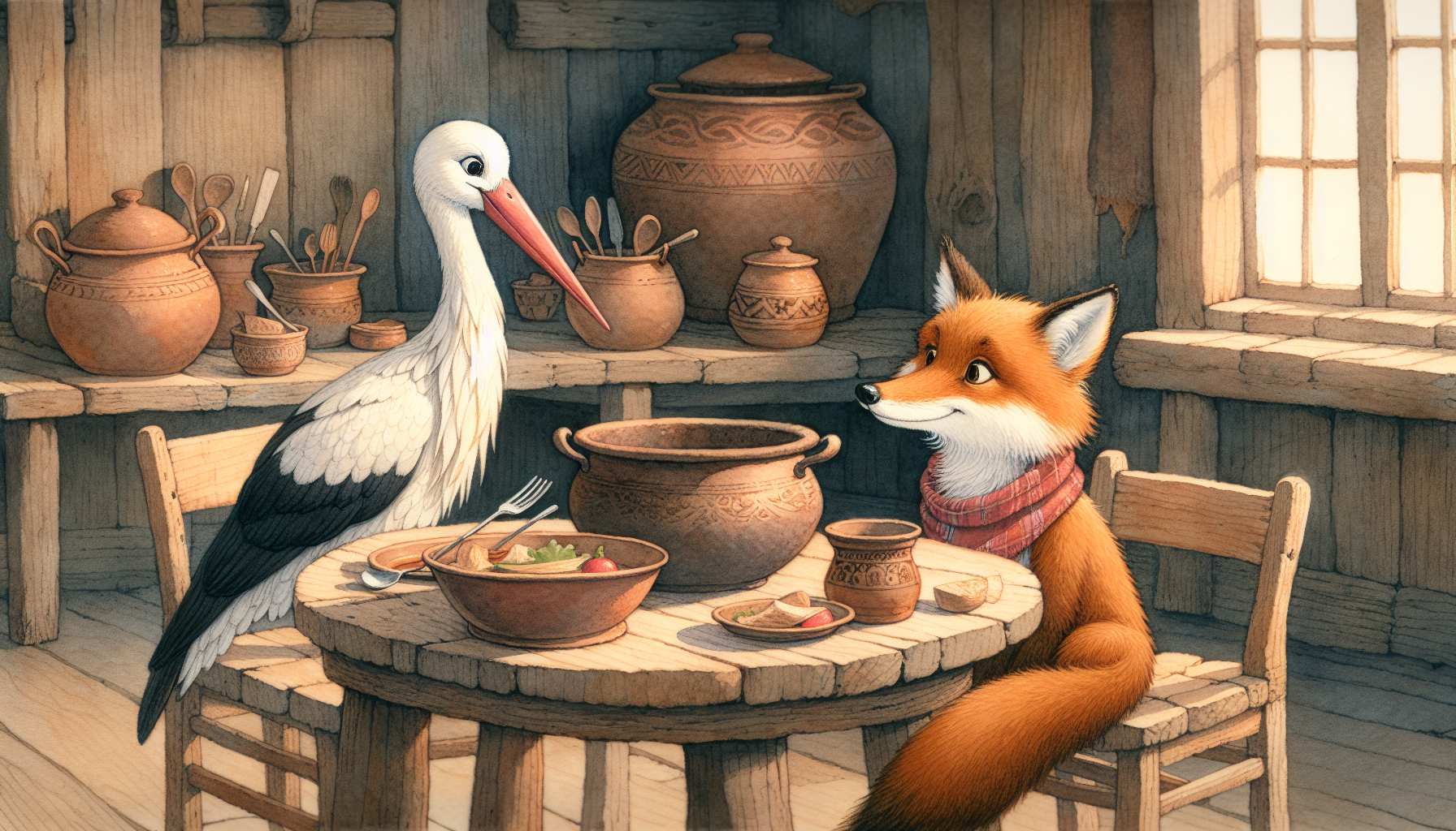 მეორეს დღეს წერომ იწვია მელი და მუხუდო შეუგბო და პირვიწროს ქოთანში ჩაუსხა. ორთავ ჭამა დაუწყეს. წერომ ნისკარტი ჩაყო და ჭამა დაუწყო და მელმან ტუჩი ვერ ჩასტია. რასა სჭამდა? იწყინა მელმან, გაუმტერდა და შეამყრალა. წეროს ეწყინა და თვალთა შეასკინტლა.