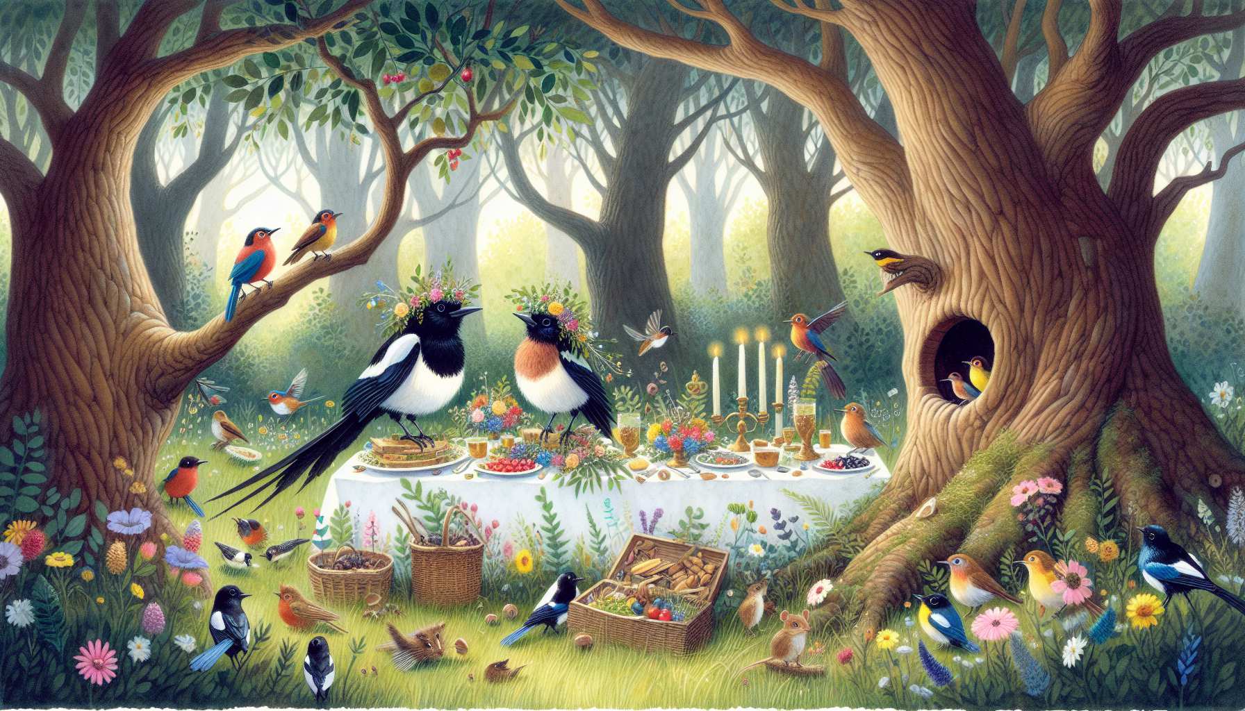 - პურსა სჭამენ და ღვინოს სმენ, სიმღერას არ იტყვიანო, - სთქვა ყვავმა და თავის მშვენიერის ხმით შემოსძახა სუფრული. ყვავს მისცეს აქეთ-იქიდან ბანი და გაძლიერდა მღერა ისე, რომ ტყეს ჭახჭახი გაჰქონდა. მთა-ბარი ზანზარებდა. ყვავილები სიცილით იხოცებოდნენ. აქვე ახლოს ერთ თაგუნიასა ჰქონდა სორო. ხმაურობაზე საღერღელი აეშალა და გამოიხედა სოროდან გარეთ. დიდხანს უცქირა ფრინველთა ნადიმს, შექცევას, ჰხედავდა მსუქანს, ნოყიერ საჭმელებს, ფერად-ფერადს, ნაირ-ნაირს და ხარბად ჰყლაპავდა ნერწყვს ნერწყვზედ. ითმინა დიდხანს და ვეღარ მოითმინა: რაც მომივა მომივაო, სთქვა; მიცუნცულდა ახლოს, ისკუპა და პირდაპირ ნეფე-დედოფლის წინ თხილიანს სუფრაზე დასკუპდა.