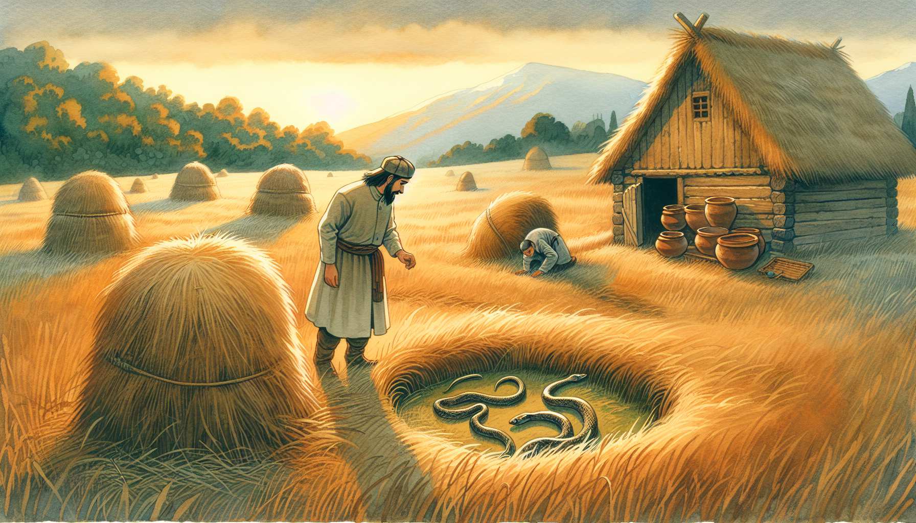 მან კაცმან რა მუშაობა გაათავა, თივა აიკიდა, შინ წაიღო. მას ღამე გველი გამოძვრა და სულ ჯამჭურჭელი დაუშხამა და თივაშივე დაიმალა.