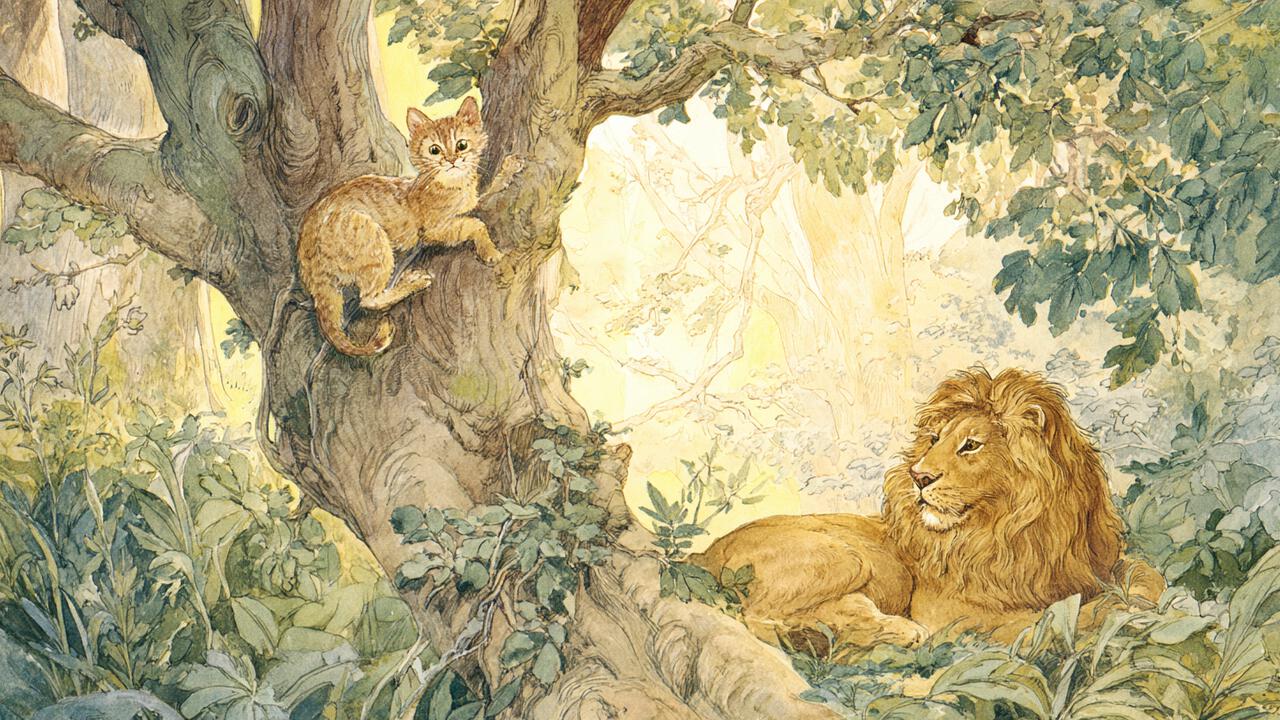დღესა ერთსა ნადირი ვეღარ იშოვნა, თავისი გამზრდელი კატა შესაჭმელად მოინდომა. კატამ რა შეიტყო, გაექცა და ხეზე გავიდა. ლომი ძირს წამოუწვა, უთხრა: ჩემო დედის უსაყვარლესო და ჩემო დამარჩენელო გამზრდელო, ყოველი შენი ზნეობა რომ მასწავლე, ეგ ხეზე გასვლა რად აღარ მასწავლეო?