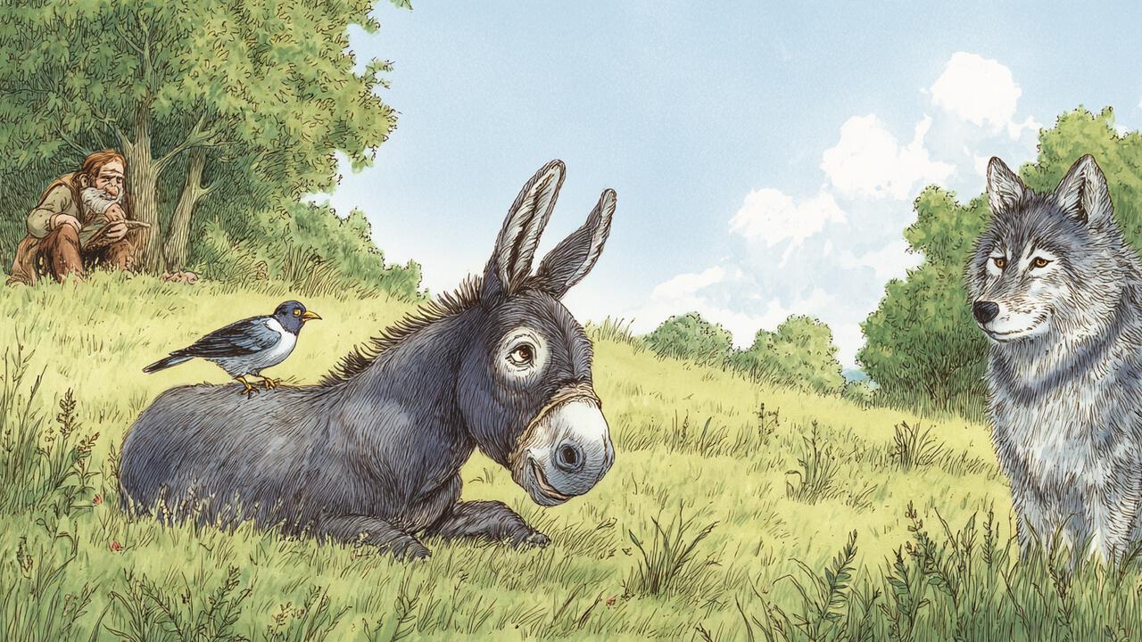 ტყიდამ ერთი მგელი უყურებდა და თქვა: მე თუ მას ვირთან მნახვენ, ამ სოფლის კაცი და ძაღლი სრულობით მე გამომეკიდებიან, და აგერ ვირი კაჭკაჭმან ლამის შეჭამოს, და პატრონი ხარობსო!