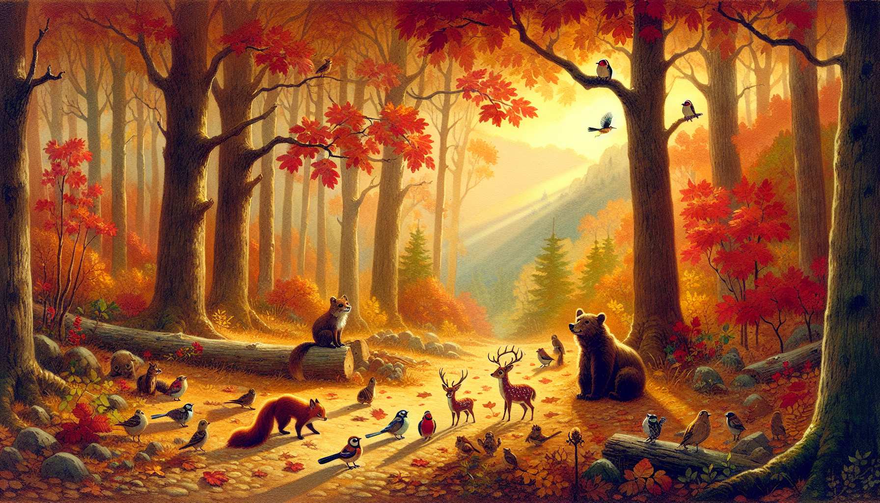 შემოდგომა მოვიდა ტყეში, მწვანე ხეები წითელ-ყვითელი ფოთლებით მოირთო და მოიქარგა. ხსივჩაღვრილ ტევრებში სუსტი ნიავი დანავარდობს და ნელი ფარფატით ცვივა დაბლა ხმობაშეპარული ფოთლები. ტყესაც თავისი ბარაქა გამოუჩენია _ ისევ იშოვება ნაგვიანევი შინდი, მოცვი და მაყვალი, მრავლად ცვივა დაბლა თხილი და რკო, წაბლი და წიწიბო, მწიფობას იწყებს ზღმარტლი, ასკილი და კუნელი. იქით ჩამოცვენილ მწიფე პანტას დაუფარავს მდელო, აქეთ წითლად დახუნძლული მაჟალო იყურება ტყისპირიდან. მოგვიანებით, ზამთრისპირზე, შქერი, ძახველი და ცირცელიც დამწიფდებიან და მეტი რაღა უნდათ ტყის ბინადრებს? ხარობენ უხვი ბუნების შემხედვარენი. ჩიჩახვდაბერილი ფრინველები დაფრინავენ აფერადებული ხეების ტოტებზე, მრავალგვარი ხილით გამაძღარი ცხოველები ზანტად დააბიჯებენ ხმელი ფოთლებით დაფარულ ბილიკებზე, ხოლო ზოგიერთები დღევანდელით არ კმაყოფილდებიან, ზამთრისთვის აგროვებენ სარჩოს და ბეჯითად ინახავენ თავიანთ ბუნაგებსა და ბუდეებში.