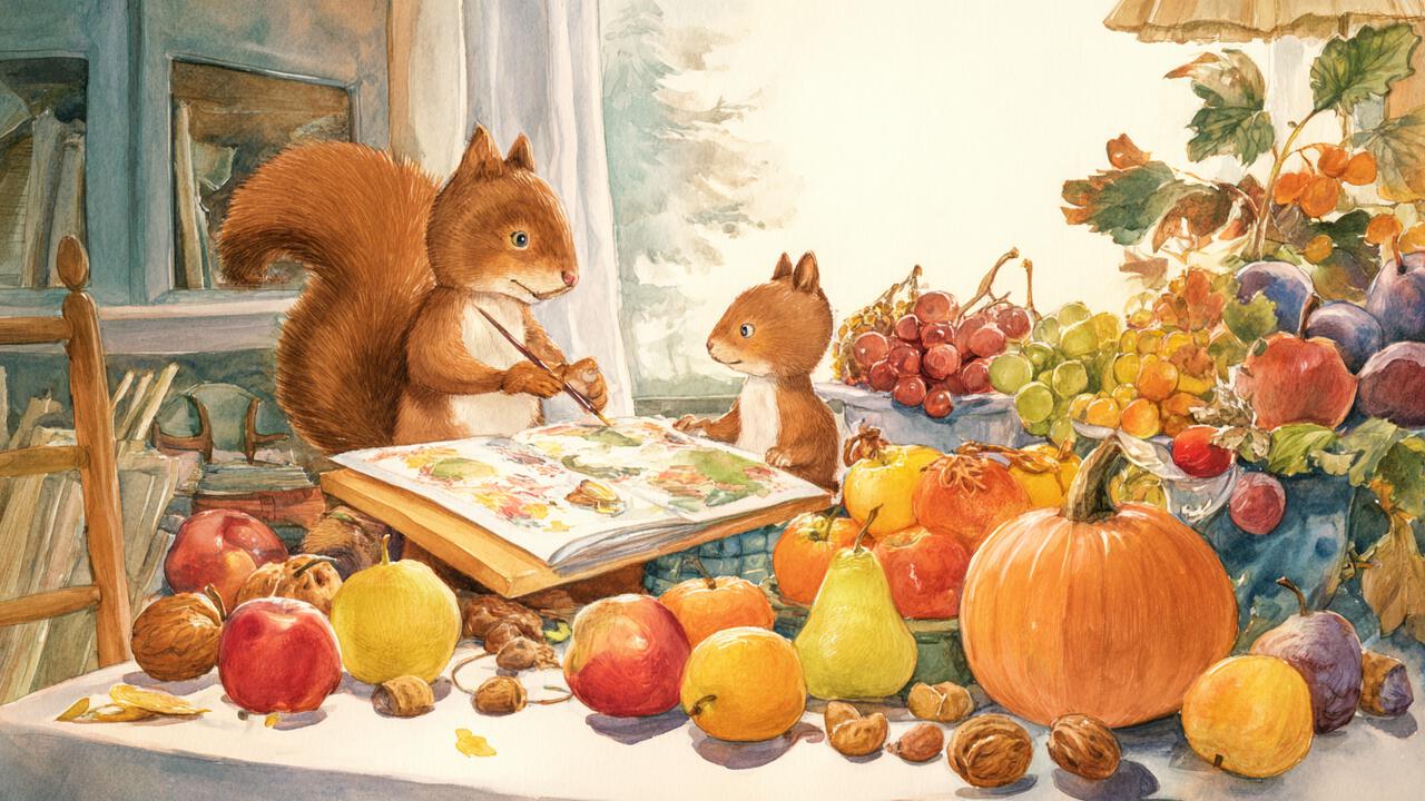 გახარებული ციყვუნია შემოდგომის სურათის ხატვას შეუდგა.