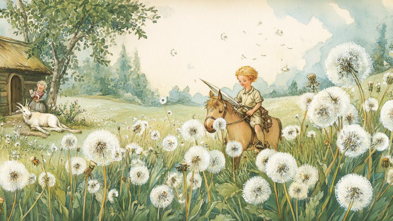 გიორგიმ ხის ხმალი მოიმარჯვა, ჯოხის ცხენზე შეჯდა და მონდორზე გააჭენ-გამოაჭენა. მინდორი ბაბუაწვერებით იყო სავსე: