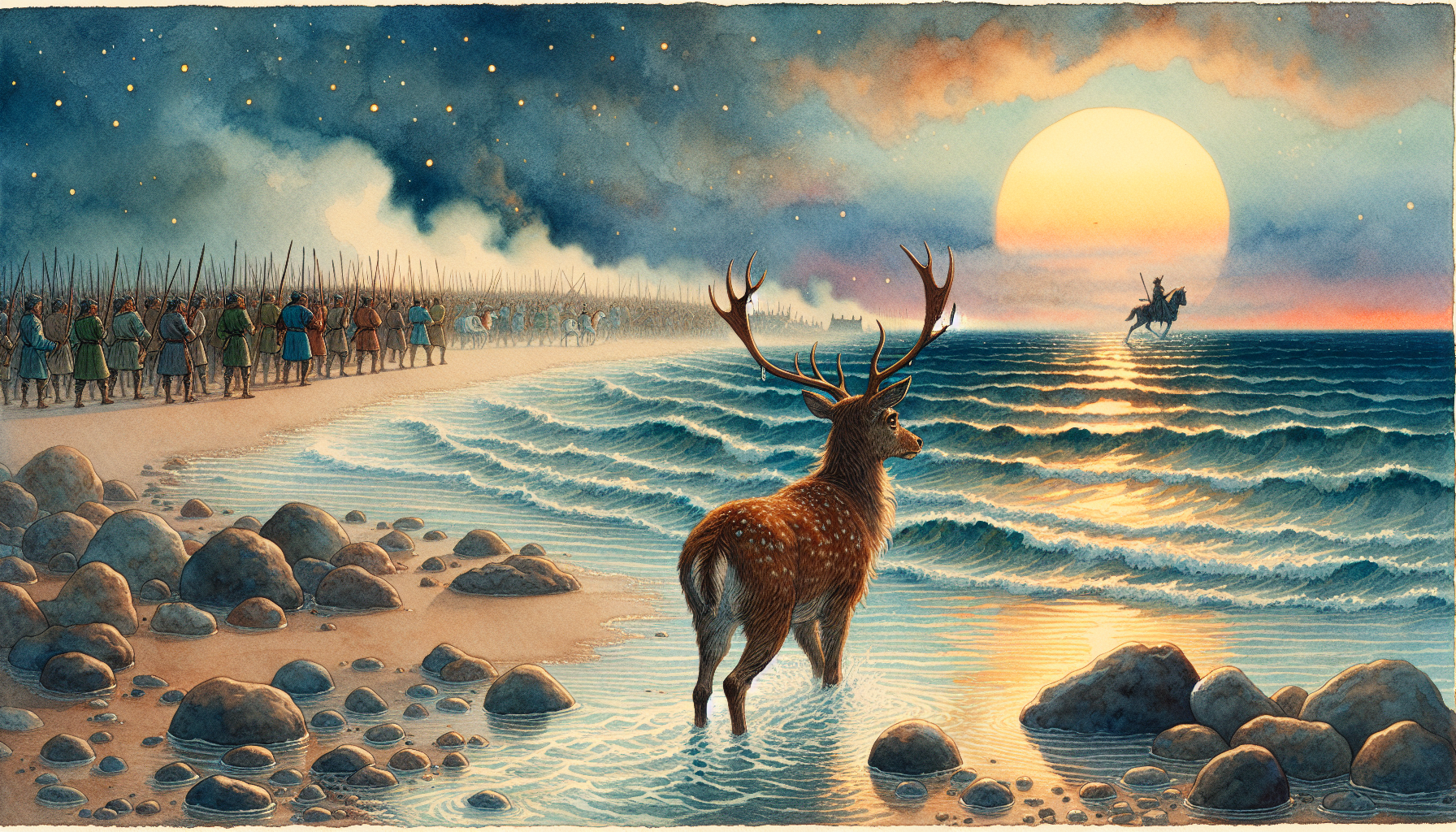 არ იქნა, ხმელეთზე ირემმა თავშესაფარი ვერსადა ჰპოვა, ვისაც დაენუკვა მფარველობას, ყველამ მოკვლა დაუპირა, რა ადგილასაც კი დასამალავად თავი შეჰყო, ყველგან თოფის წვერი დაუხვდა. ყველგან მახვილი მოსაკლავად. არა სჩანდა ხმელეთზე მისთვის თავშესაფარი, და აგერ ზღვა გამოჩნდა, თვალგადაუწვდენელი, დიდი ოკეანე.