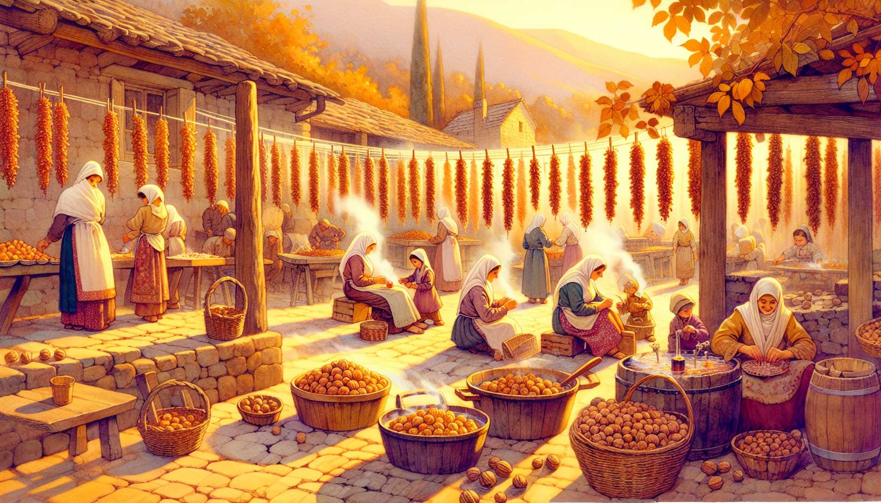 მთელი ერთი თვეა, რაც ჩვენს სახლში მხოლოდ ეს სიტყვებიღა ისმის. მაშინ, როდესაც მამაკაცები მთელს დროს ქვევრების რეცხვას, საწნახელის გაწყობას, გოდრების წვნას, სართველოდ ვენახის გამოწმენდას ანდომებენ, დედაკაცები სულ ჩურჩხელების სამზადისში არიან. რვა ენკენისთვეს კაკლის ბერტყვა დაიწყო, დედათქვენმა კრეფის დროსვე საუკეთესო კაკლები გადაარჩია, დაკროლა, წენგოსაგან გასუფთავებული, დიდს ჭილობზედ გაგვაშლევინა მზის გულზედ და თვითონ აივნიდგან თვალმოუშორებლივ ორი-სამი დღე უყარაულა.