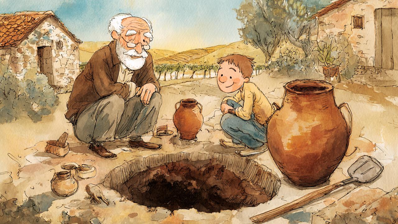 ერთხელ ბერიკაცმა ნიჩბით გადახადა ქვევრს მიწა.